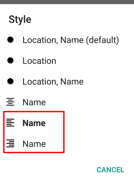 Whereas "Style → Location?" will only display a point for the edited item. All other items will have the text displayed.