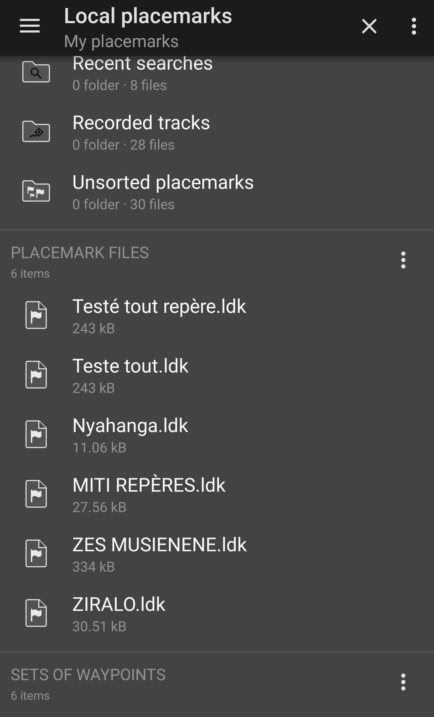⚠️Autre soucis, c'est que lors de l'exploration des PLACEMARKS dans le dossier par défaut (PLACEMARK FILES) ; certains placemarks x.ldk ne sont pas listés alors qu'ils sont retrouvés dans le Workspace Swich 🤷🏿‍♂️, comment actualiser le dossier PLACEMARK FILES afin qu'il reconnaissent ces autres x.ldk ? J'ai redémarré, j'ai fouillé dans la mémoire interne, dans le SD ainsi que tous les dossiers car je voulais exporter le tout en un seul KMZ mais :cry: