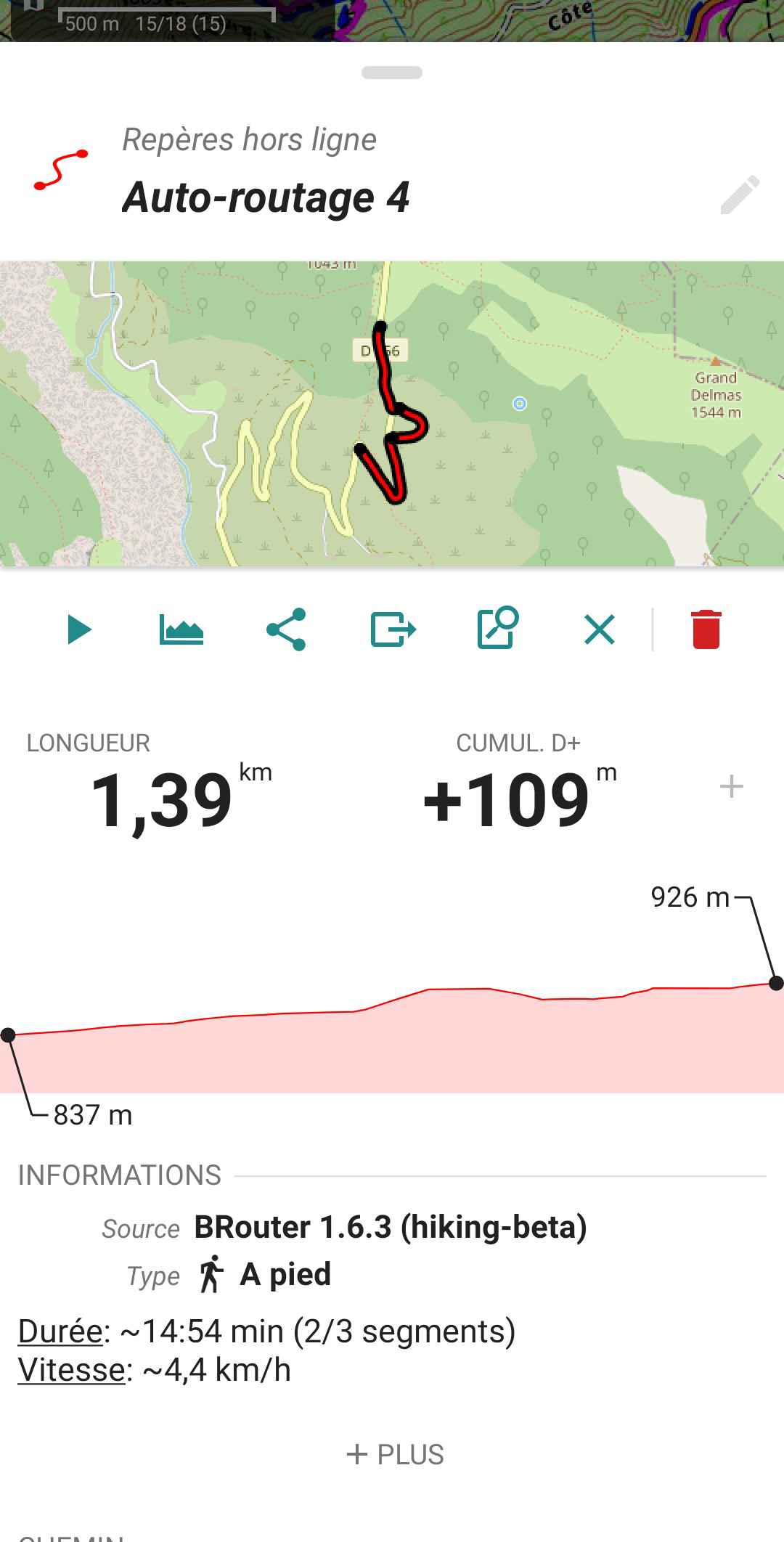 Normalement si vous sélectionnez un segment "auto-routé" dans l'explorateur de repères, l'application vous donne toutes les infos comme le service utilisé pour le routage, le type de déplacement, et diverses infos comme la vitesse et durée estimée.