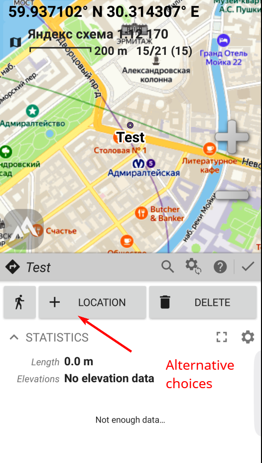 I set point A on the map, point B is in my placemarks. To build Auto-routing now, I must first open point B so that it is displayed on the map. Then I have to move to it (center of the screen to the point) and click +LOCATION.