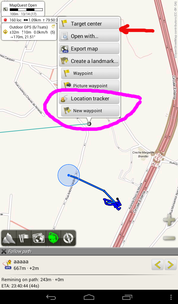 - The 'Create waypoint' under 'Location Tracker' currently adds a waypoint to the tracker at the center screen location (that was the point of our discussion). As noticed CRIder, when the center screen is locked on the GPS location, this button behaves just like you would like, but with keeping the ability of adding a tracker waypoint somewhere else, not necessarily on your track, when moving the center screen away.