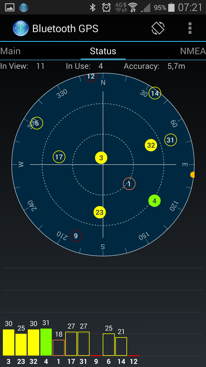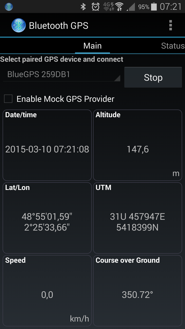 Pour pouvoir le connecter a mon téléphone j'ai utilisé l'application "Bluetooth GPS " jusque la pas de soucis je lance l'application elle me demande ma source GPS je lui indique le GPS bluetooth et elle se connecte dessus, m'indique ma position et le nombre de satellites.