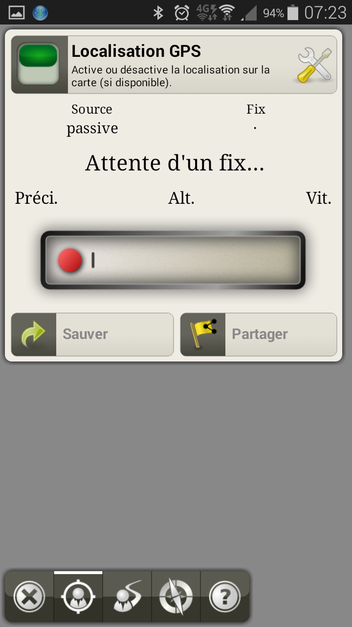 Après avoir sélectionné la source "Externe" dans AlpineQuest puis validé, le bouton de la localisation devient-il vert? Quel message de statut apparaît au milieu de la fenêtre?