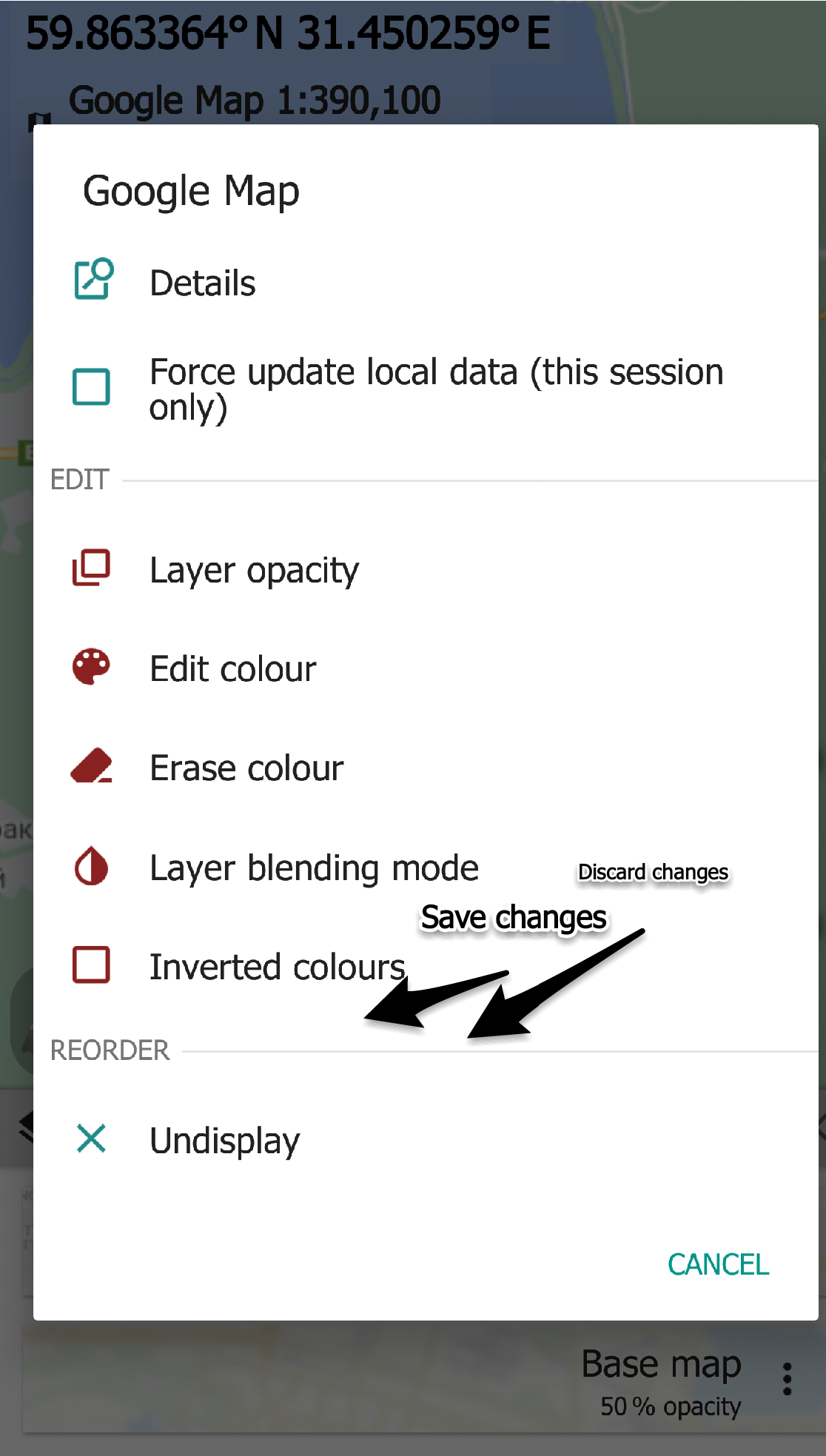 The idea is to save changes or discard them if required separately for every displayed map. The changes are saved even if I close the map and open another map and then go back to the map where I made changes.