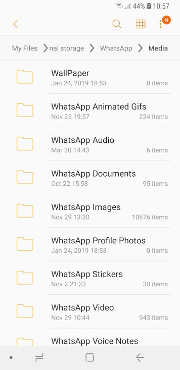 Например, здесь, в файловом менеджере по умолчанию, папка WhatsApp/Media показывает только 9 элементов, но когда вы откроете ее: вы увидите, что 9 папок содержат тысячи файлов: Что касается пункта 2, в настоящее время приложение использует имя файла, чтобы легко найти последний записанный трек, не открывая файлы (просто отсортируйте файлы треков по имени и выберите последний), поэтому важно, чтобы имена начинались с даты.