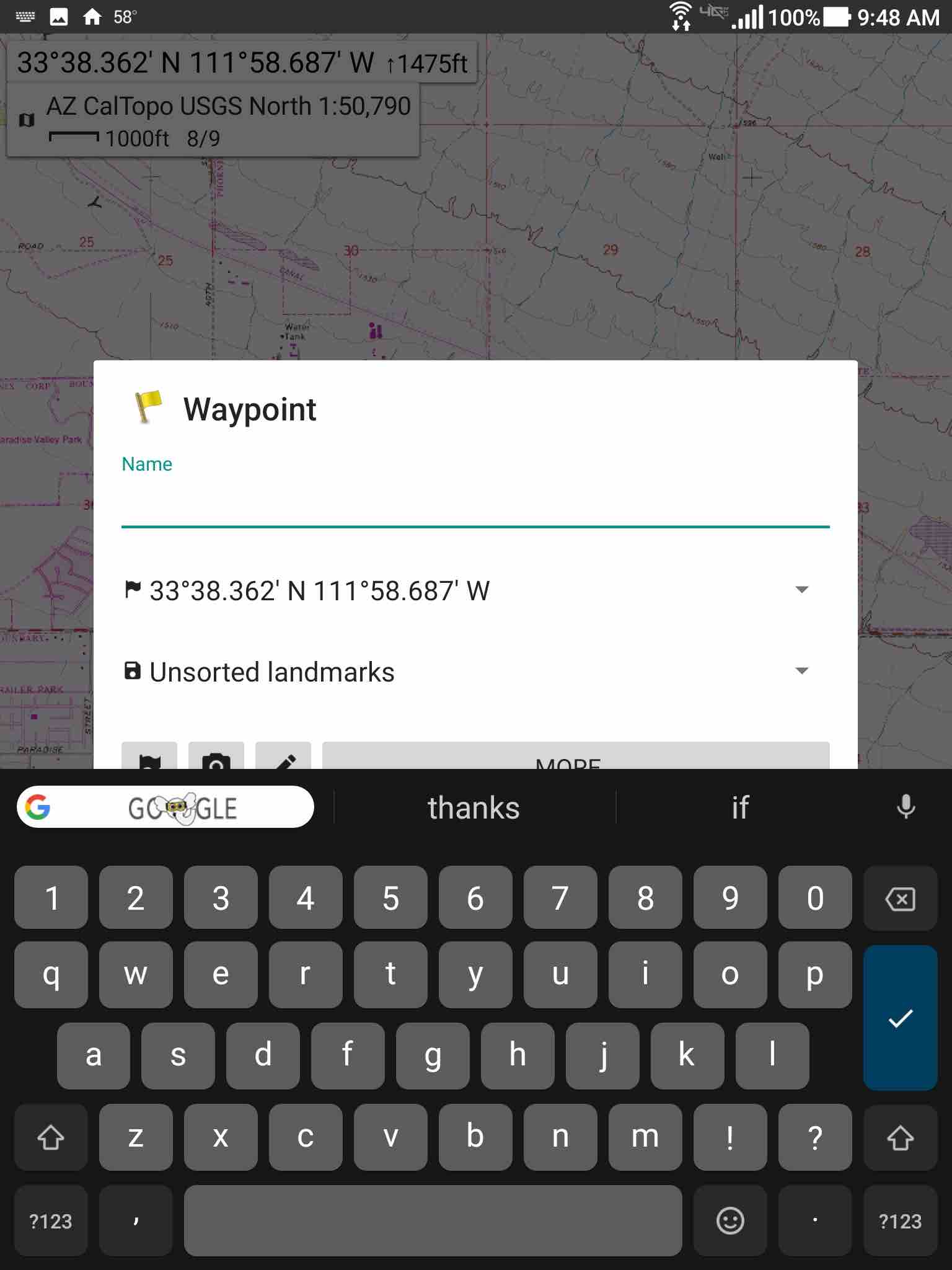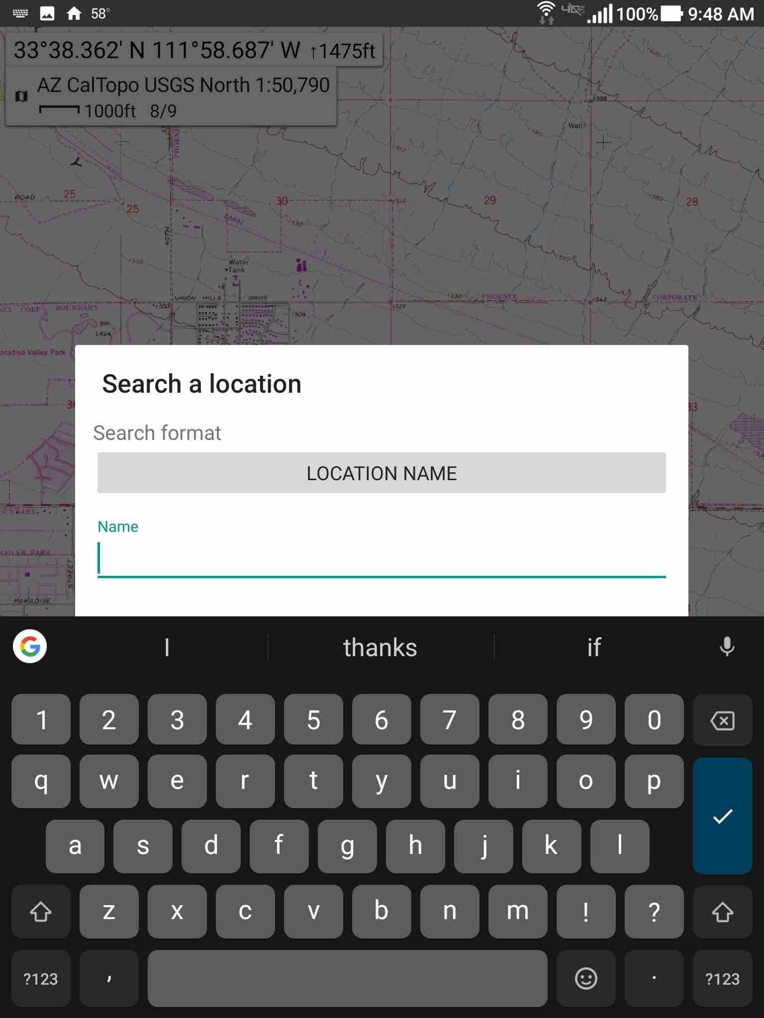 3) on my tablet, both the "create waypoint" and "search location" dialogs stay centered on the screen when they open and therefore are partially hidden by the keyboard. on my phone the dialogs correctly move up above the keyboard.