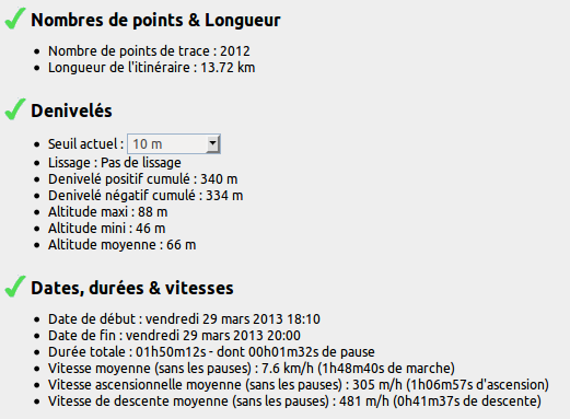 Voici en tout cas le comparatif (cohérent) des statistiques pour votre parcours entre VisuGPX (13.72 km) et AlpineQuest (13.18 km):