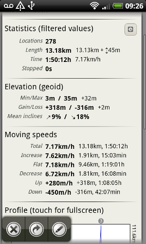 La distance du parcours réellement effectué est sûrement un peu au dessus de la réalité, à cause de la précision du GPS comme expliqué précédemment, mais je pense que cette distance reflète plus la réalité.