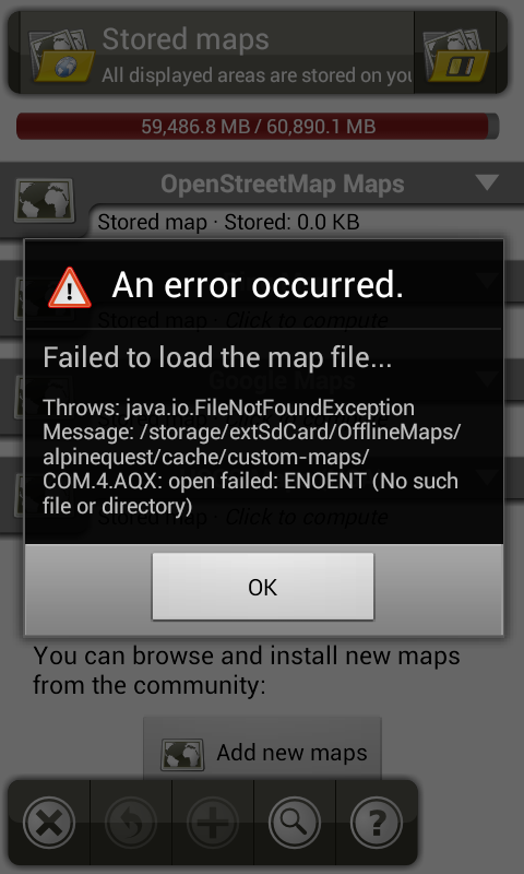 I have many Gb of 'community' maps (UK Explorer Topo) downloaded in /storage/extSdCard/OfflineMaps[/cache/custom-maps] and these are correctly visible offline when using OM. Problem is, if I install AQ it makes assumptions about the directory name. When I try to define the 'Storage device' so I can use these maps it appears that however I define the path, the program appends /alpinequest so it is not possible to point to the maps located in /storage/extSdCard/OfflineMaps. AQ throws a Java exception since, of course, the directory does not exist. See screenshot.