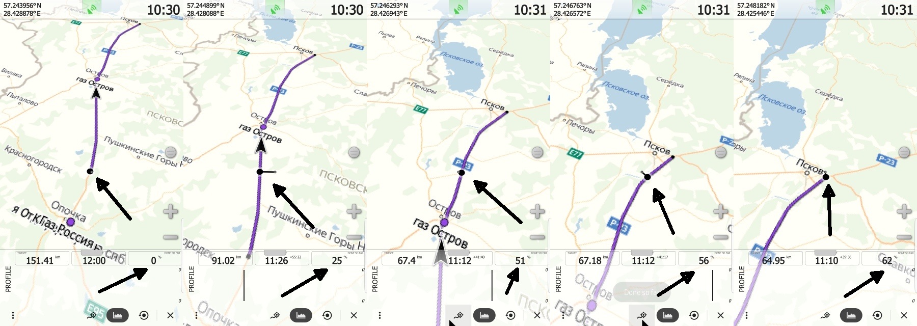 When I move along the track by GPS, the app shows the distance done in % in the upper right corner of Explorer Mode panel. I have 33%, I turned on the recording screen after I passed 33%. But this is not important in this case. When I get to the finish point, the application should display 100%, that is the distance done increases and reaches 100%.