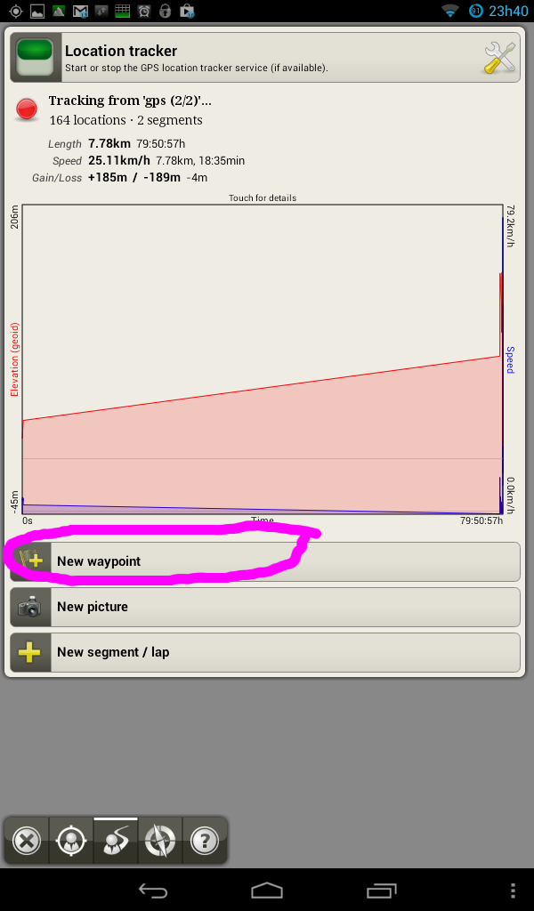 - The 'Create waypoint' under 'Location Tracker' currently adds a waypoint to the tracker at the center screen location (that was the point of our discussion). As noticed CRIder, when the center screen is locked on the GPS location, this button behaves just like you would like, but with keeping the ability of adding a tracker waypoint somewhere else, not necessarily on your track, when moving the center screen away.