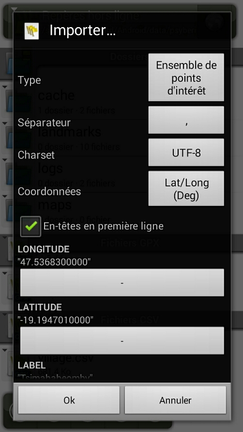 - Pour le fichier CSV, je n'ai pas encore mis l'aide à jour, mais d'après votre image, il faut encore cliquer sur les boutons de chaque ligne pour affecter au moins la "Longitude" et "Latitude" (les boutons sans texte).