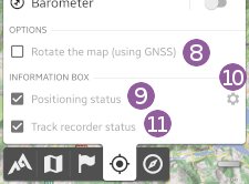 • Positioning status hides or displays of the top/left information box containing the most important positioning information. Tap on the settings wheel icon to choose what information to display at the screen center;