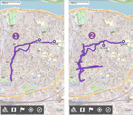 Some devices perform better than others when using the GPS, depending on the quality of the hardware used and the internal conception (placement of the GPS chip inside the device). Some devices require a stronger GPS signal to give an acceptable accuracy. For example, here is the same track recorded at the same time by two different devices (one in the left pocket, one in the right) during a small outside walk with occasional stays inside buildings. We can see that the Samsung Galaxy S9