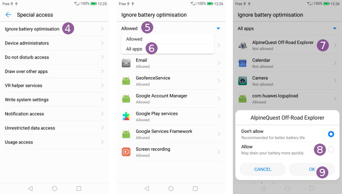 It runs in a light background service called the “AlpineQuest agent”, and can track your locations even if the main application is completely closed to save as much battery as possible. If you use any memory cleaning application, be sure to exclude the agent from being automatically killed.