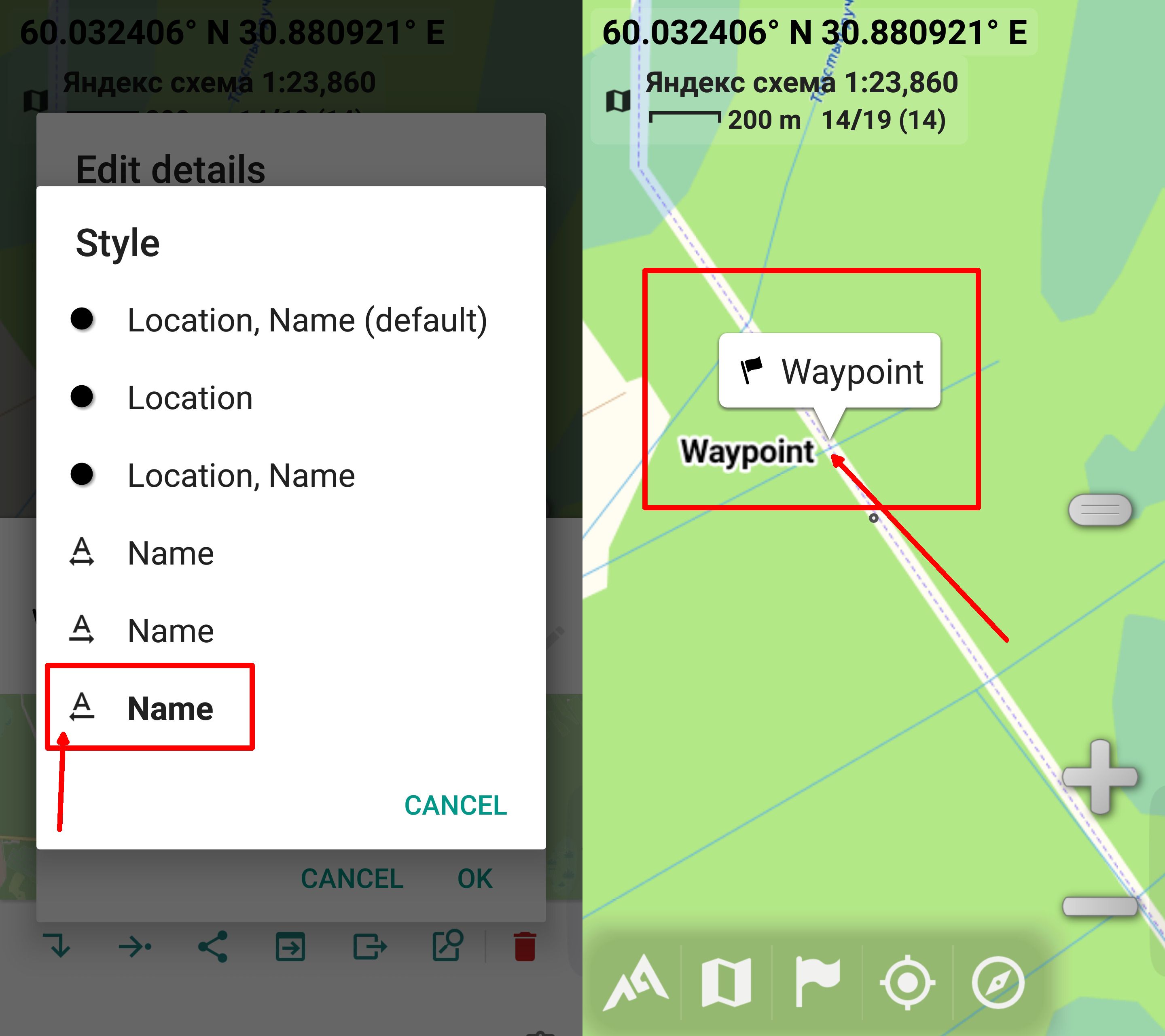 What I mean by that is if the text is on the left in the setting, then the text on the screen near the placemark is on the right.On the application screen, it looks the reverse.