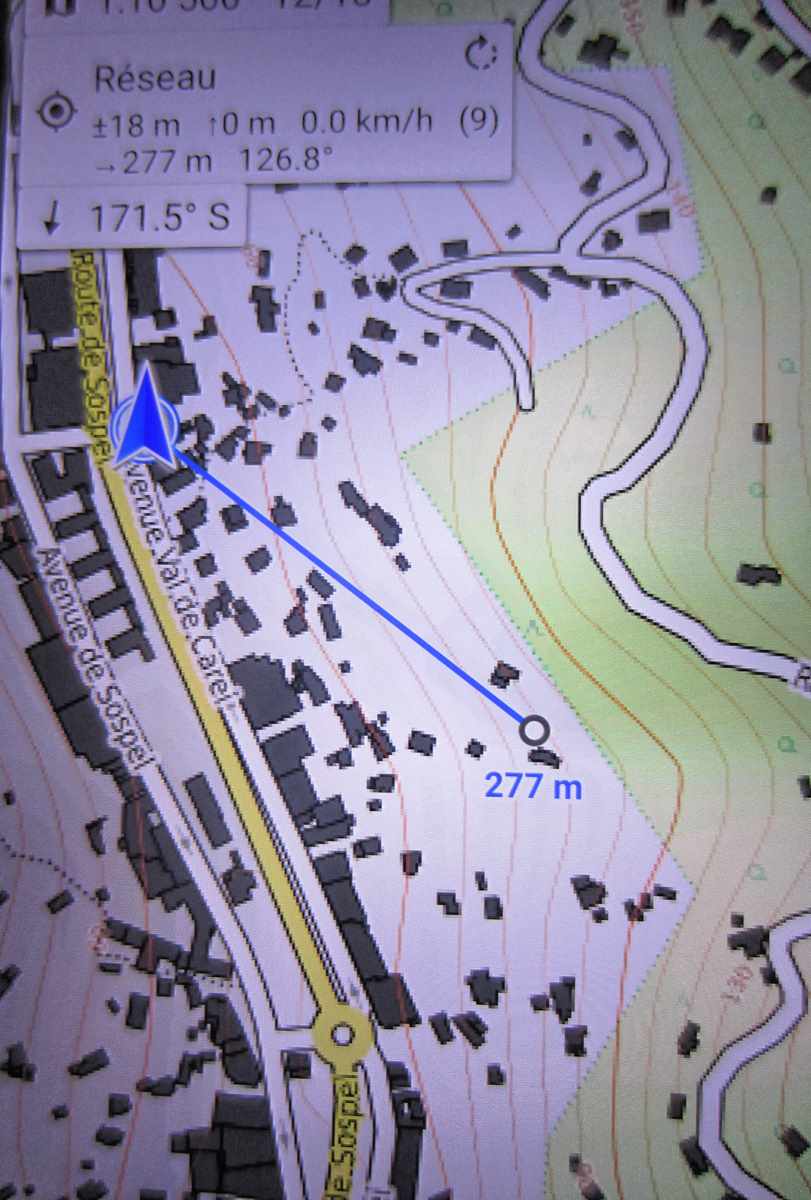 Si le GPS est éteint alors la ligne de distance (bleue) n'est pas affichée.