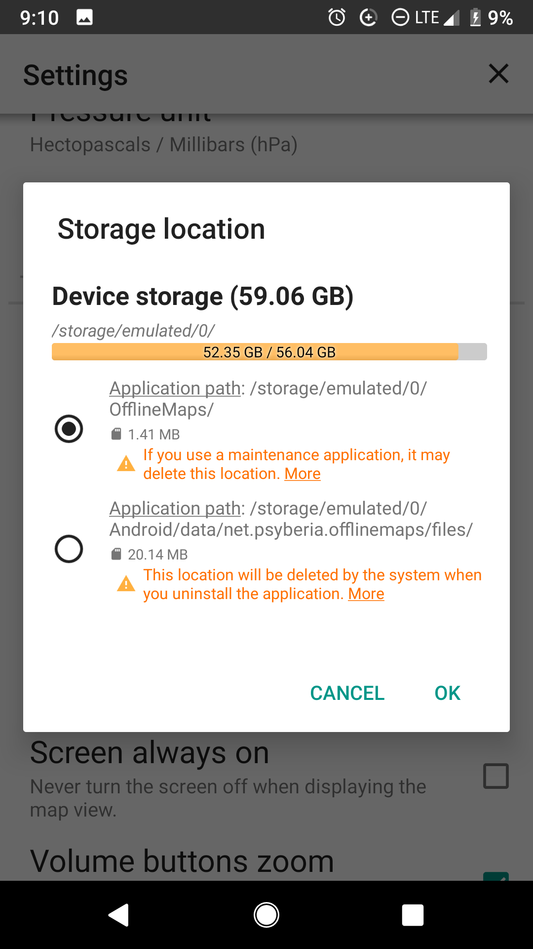 Storage location specified in user settings is /storage/emulated/0/OfflineMaps/