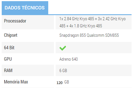 Meu celular é um Xiomi MI 9t (Processador - 1x 2.84 GHz Kryo 485 + 3x 2.42 GHz Kryo 485 + 4x 1.8 GHz Kryo 485) , (chipset - Snapdragon 855 Qualcomm SDM855).