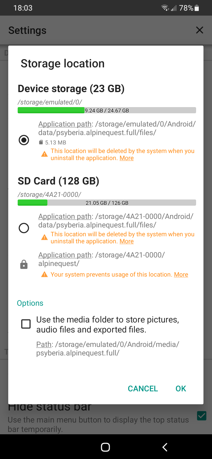 I have transferred all directories and files related to AlpineQuest (Full) from the SD card of my old phone (Android 7) to the SD card of my new phone (Android 11). The files reside in a directory named /AlpineQuest but they cannot be used by AlpineQuest because of the file restrictions in Android 11. The files must be placed in one specific location (the only one offered when viewing Settings > Storage Location) :
